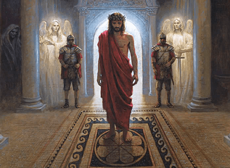 Has the world ever seen such restraint on the part of any defendant? Not only was He innocent of the charges made against Him, He commanded an unseen corps of warrior angels, ten thousand in number, ready to spring to His rescue with the slightest signal from their Master. But they were not given the order to rescue, to defend, or even to secure Jesus from further injustice. I am sure angel-heads shook in dismay. What was the Father’s plan? Why was such a thing happening before their eyes? If angels have ever breathed hard, it must have been then; angel-muscles rippling with angel-weapons tightly gripped and at the ready.